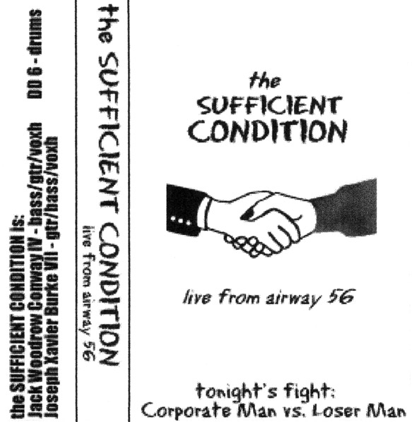 The Sufficient Condition is a two-piece four-track project of very limited activity from Paw Paw, Michigan. Devised in 1996 by Jak W. Conway IV and Joseph X. Burke following the collapse of Four Heaping Teaspoons, TSC continues to record whenever the opportunity for physical and geographical duality presents itself. This page serves as a permanent means to document the project for us, those who were involved at the time, and those who are interested now. Lyrics and track commentary to be posted soon. Inquiries, comments, and obituary notices can be directed to Jak and Joe. If you plan on using any of this music for various projects, please contact us to appease our own curiosity. Thanks! Download Information: All MP3's are iPod-friendly 128kbps tracks and can be downloaded below. On a Mac, to download, Ctrl-Click the link and select "Save Linked File To Desktop" (or the equivalent, depending on browser). On a PC, right-click and select "Save Target As..." (again, or the equivalent). |